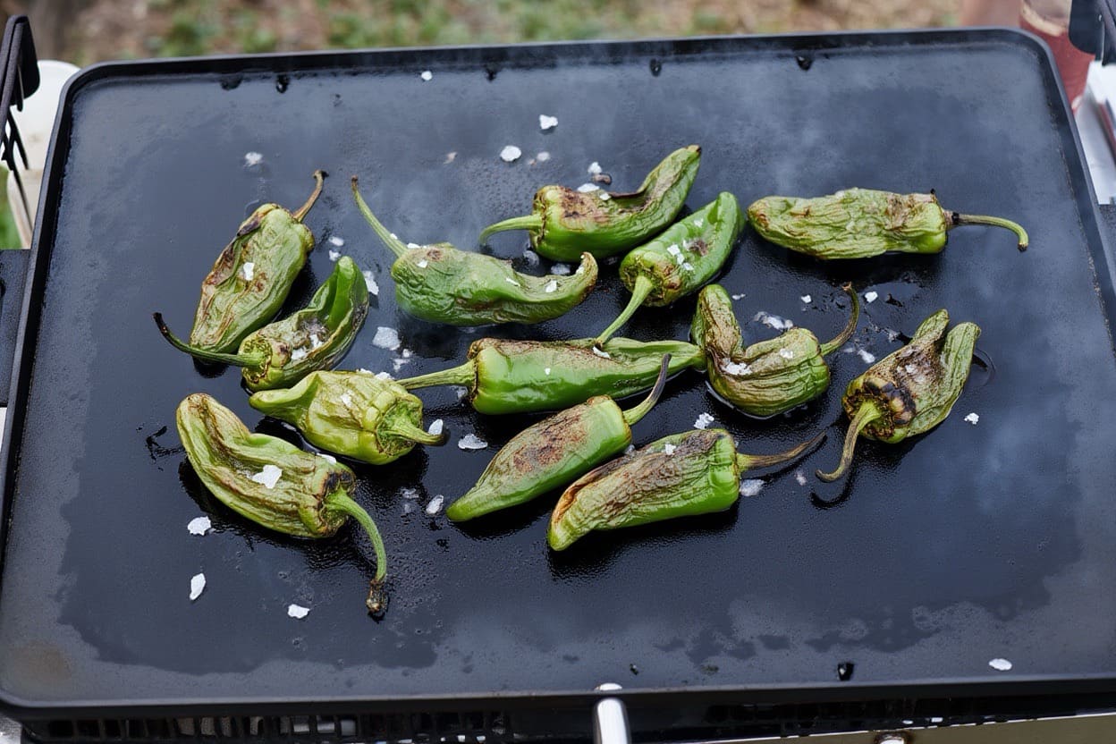 - Retirer les piments de padrón de la plancha, les égoutter sur du papier absorbant pour éliminer l’excès d’huile, puis les disposer dans un plat.