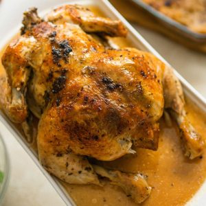 Faites cuire avec le couvercle extra crisp du Cookeo en mode rôtir pendant 45 minutes pour un poulet de 1Kg. Consultez le détail plus haut sur cette page pour savoir comment adapter le temps de cuisson à la taille du poulet.